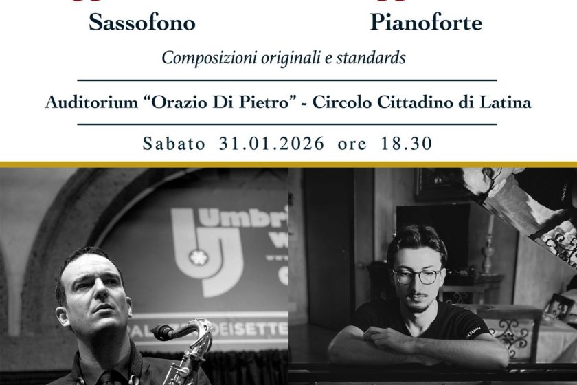 Sabato 31 gennaio alle ore 18:30 si terrà un concerto jazz presso l’Auditorium Orazio Di Pietro del Circolo Cittadino in Piazza del Popolo 2 a Latina. Protagonisti della serata saranno il duo formato dal sassofonista Filippo Bianchini e dal pianista Giuseppe Caracci, che proporranno al pubblico un programma raffinato alternando composizioni originali a grandi classici del repertorio jazz degli anni ’50 e ’60 e brani tratti dal Great American Songbook.